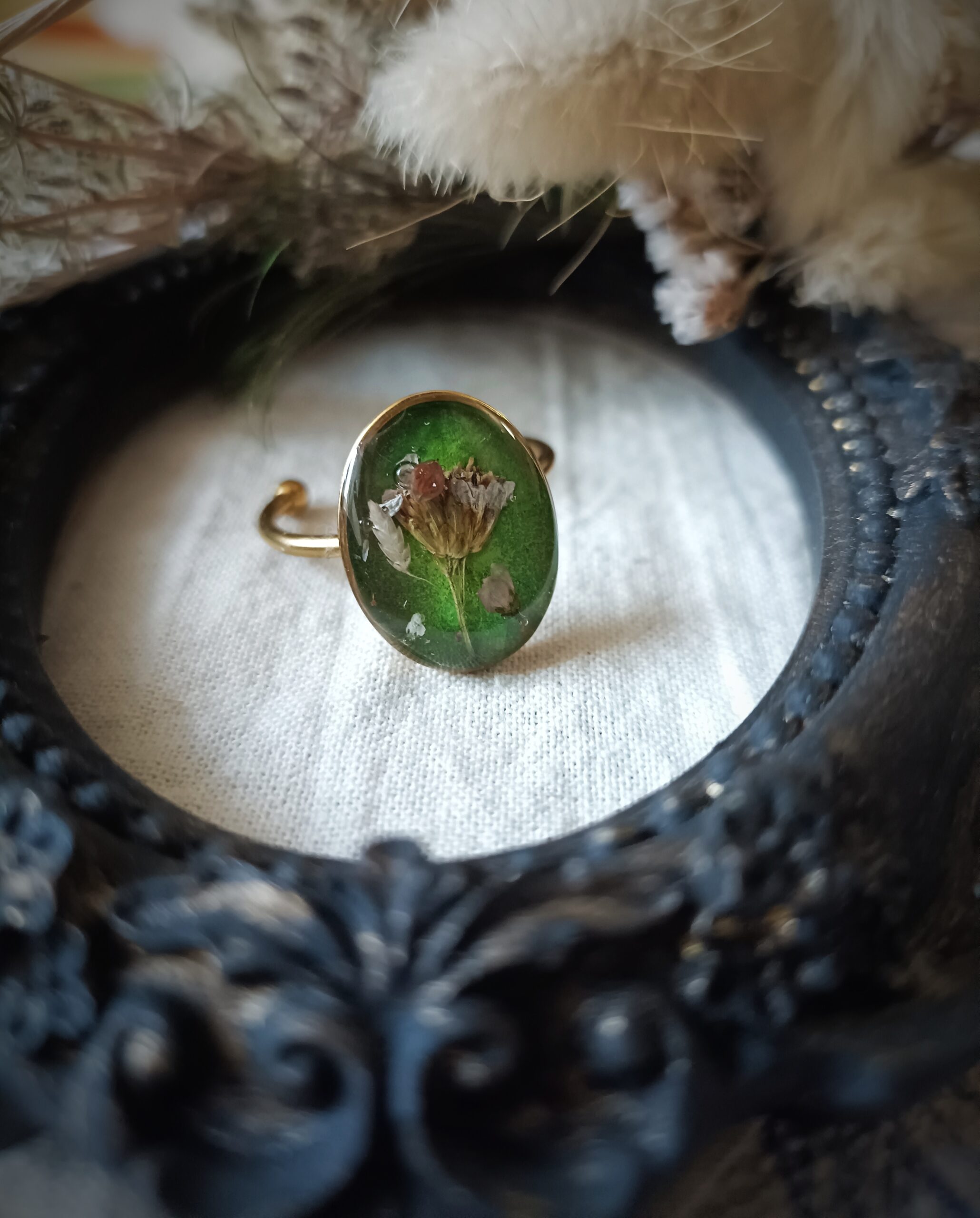 Composition de fleurs séchées cueillies en Lozère. Il s’agit de l’Achillée, Bruyère, Carotte Sauvage et de Graminées. De la résine est coulée sur les fleurs pour les protéger.