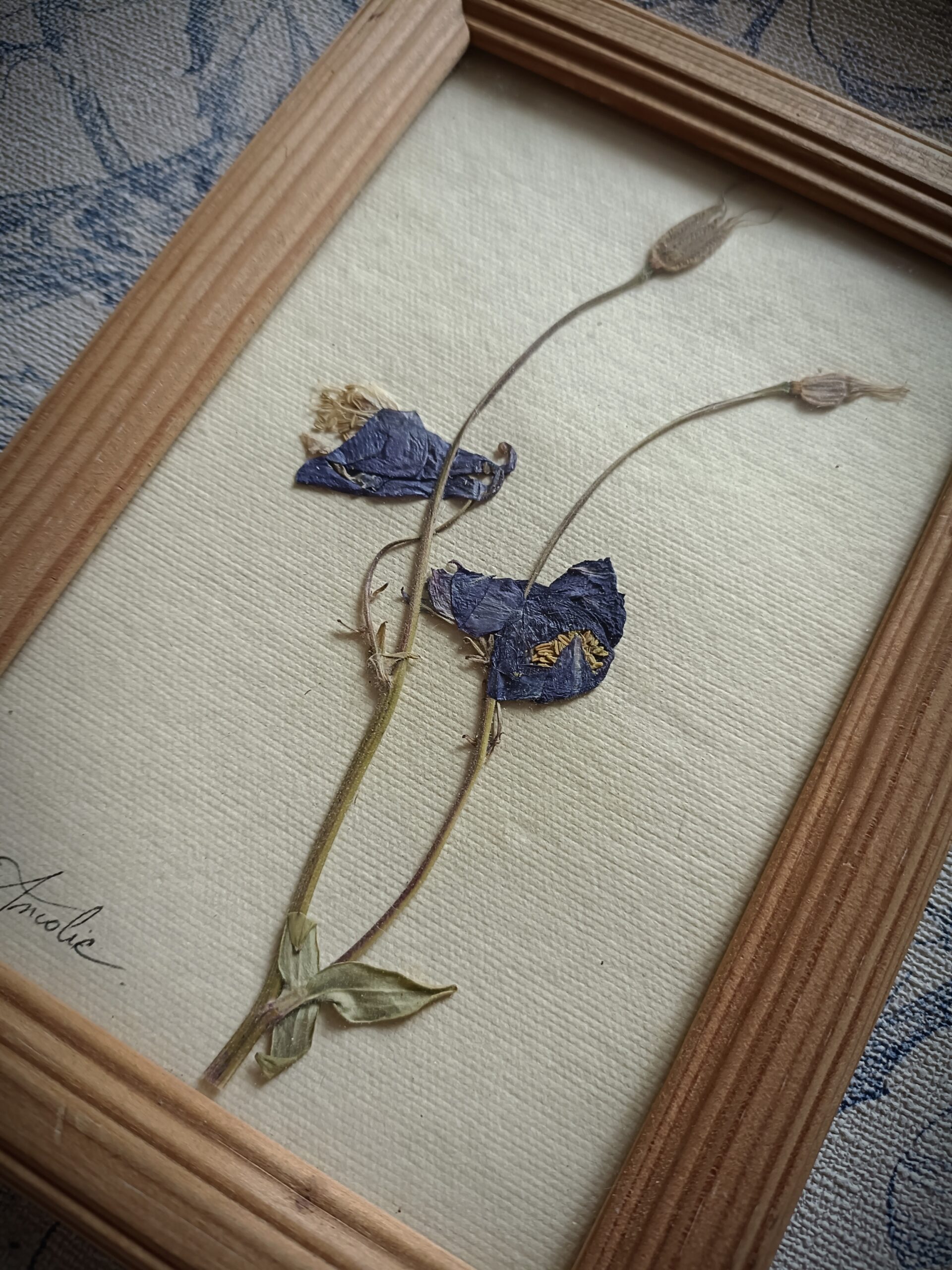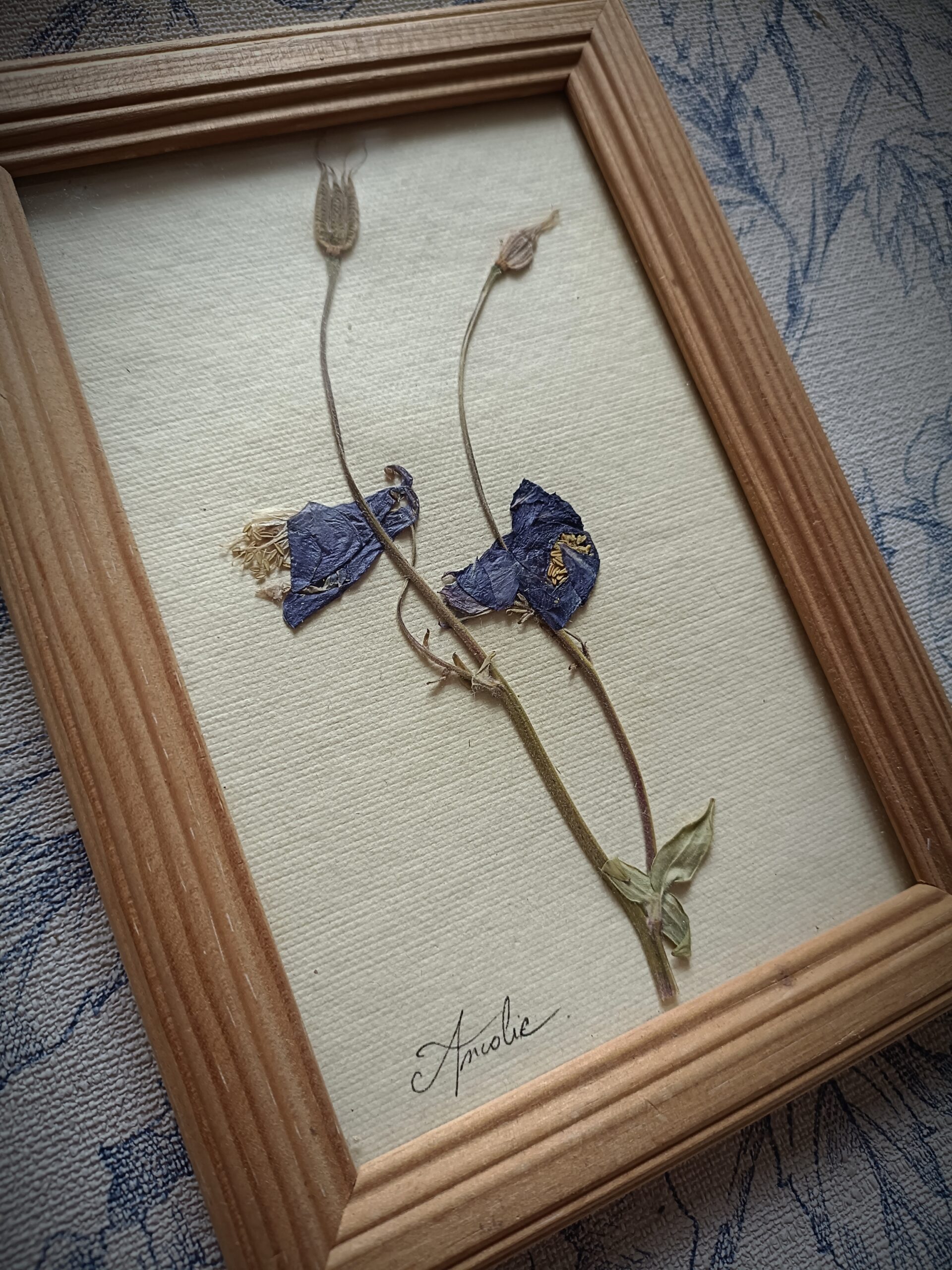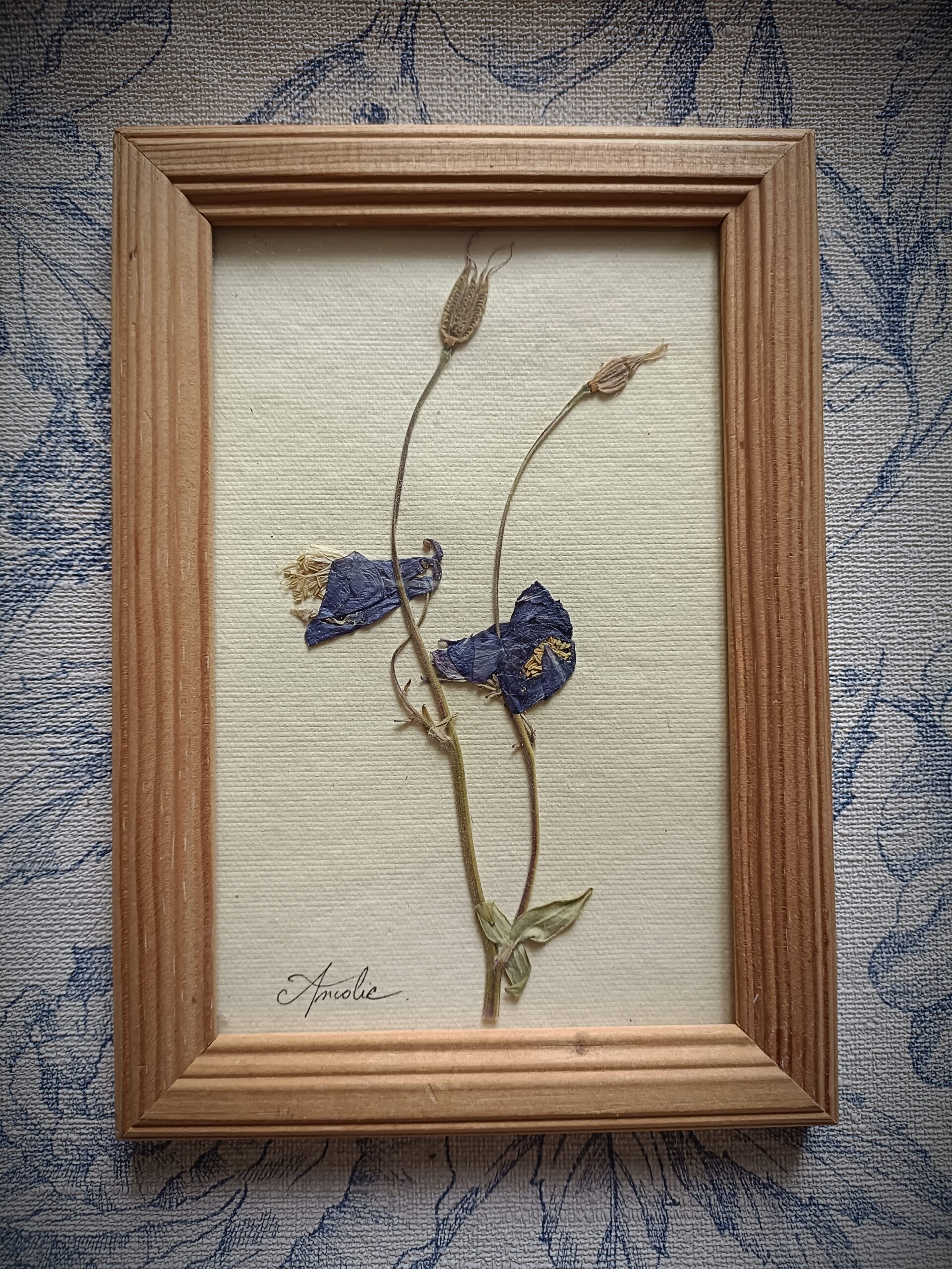 Cadre herbier d’Ancolie cueillie à Belcastel en Aveyron puis mise sous presse.