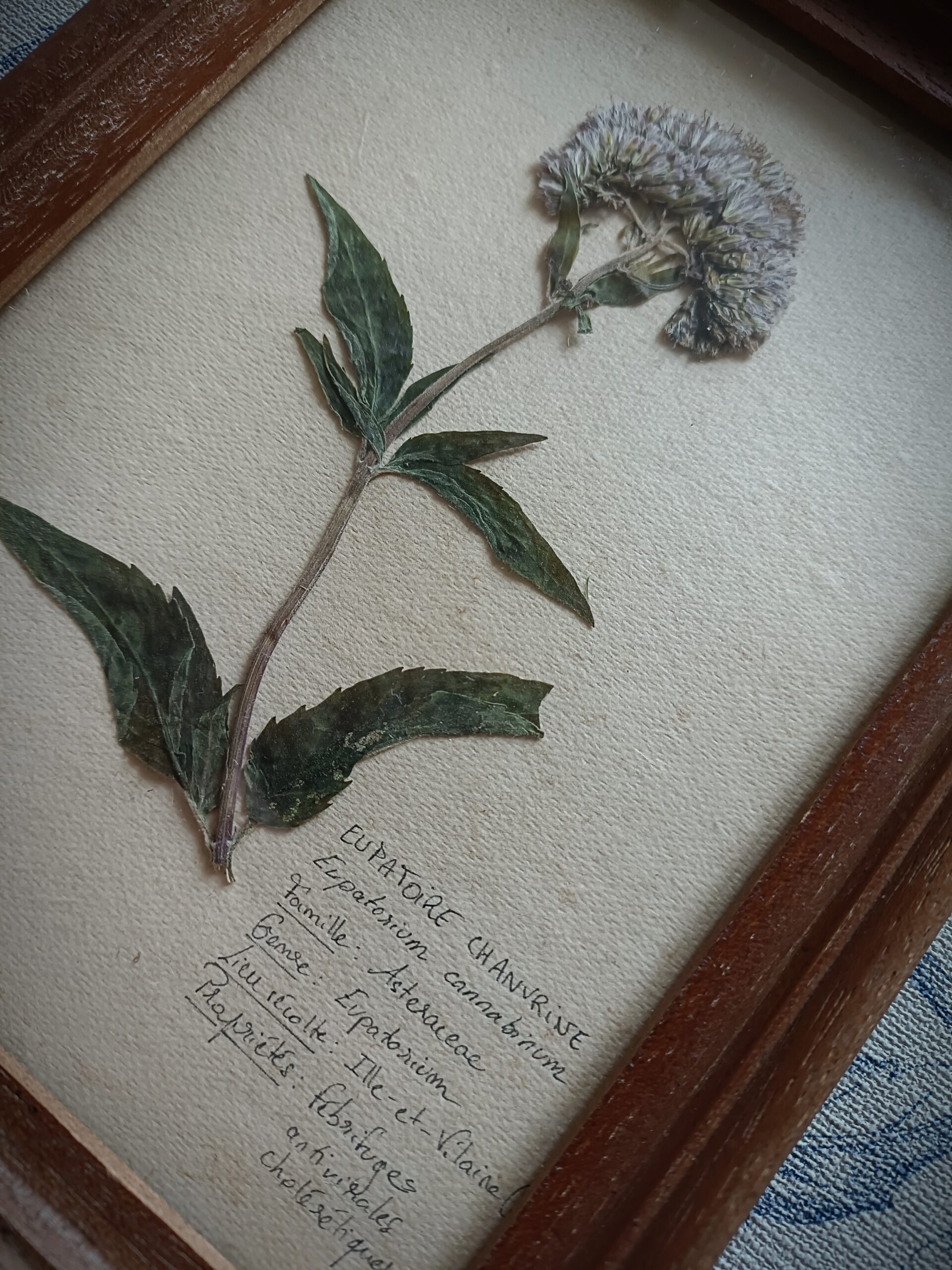 Cadre herbier d’Eupatoire Chanvrine cueilli en Bretagne puis mis sous presse.